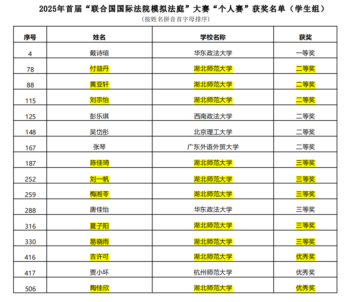 yl23455永利官网代表队由法律硕士研究生吉许可,社会工作研究生刘宗怡,英语语言文学研究生刘一帆,2023级法学本科生付益丹、黄亚轩、陈佳琦、梅湘苓、夏子阳、陶佳欣,以及2022级国际经济与贸易本科生易晓雨组成,由法学系黄梅和吴昊老师担任指导教练。十名参赛队员发挥出色,凭借扎实的专业基础、稳定的心理素质和优秀的临场表现,从全国众多参赛者中脱颖而出,最终荣获3项二等奖、5项三等奖和2项优秀奖。这一成绩不仅体现了队员个人的卓越能力,也是yl23455永利官网长期以来坚持实践育人、推进学科交叉融合、强化涉外法治训练成果的集中展现。