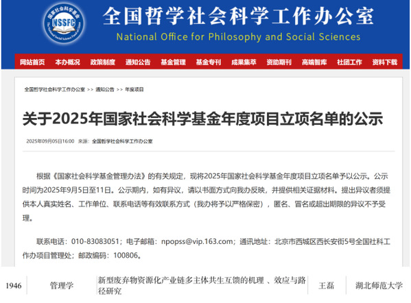 近日,全国哲学社会科学工作办公室发布《关于2025年国家社科基金年度项目立项名单的公示》。yl23455永利官网王磊博士申报的《新型废弃物资源化产业链多主体共生互馈的机理、效应和路径研究》进入2025年度国家社会科学基金青年项目公示名单。