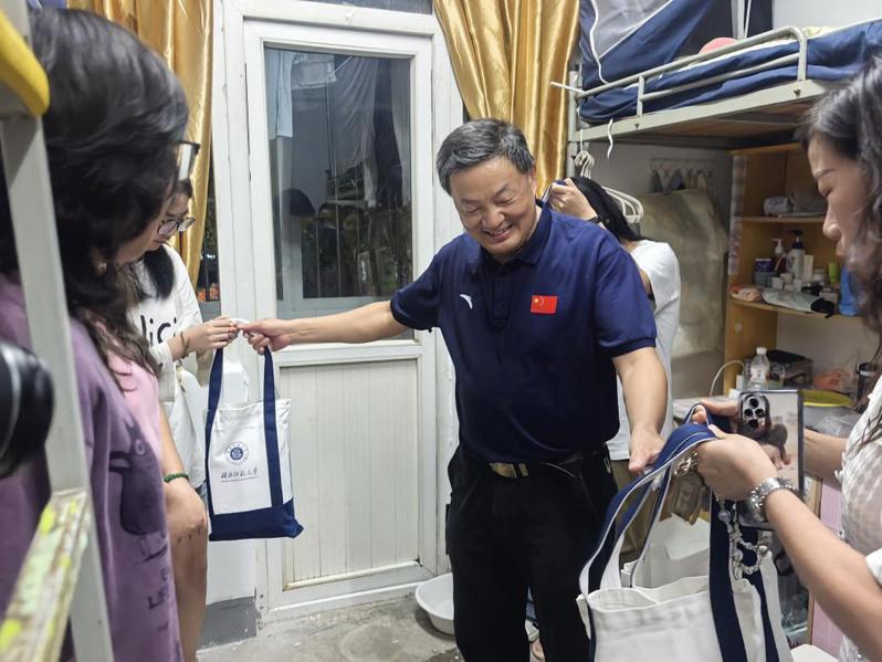 随后,雷儒金一行来到31栋新生宿舍,与同学们热情交谈。雷校长鼓励大家树立远大理想,尽快适应大学生活,扎实学好专业知识,努力成长为对国家和社会有贡献的栋梁之才。他叮嘱同学们要明确目标、做好规划,积极准备专业考试,在拼搏奋斗中实现人生价值。交流过程中,雷校长还详细了解了同学们的生活需求,在走访的同时,为新生送上了暖心大礼包,表达学校对他们的欢迎与关怀。