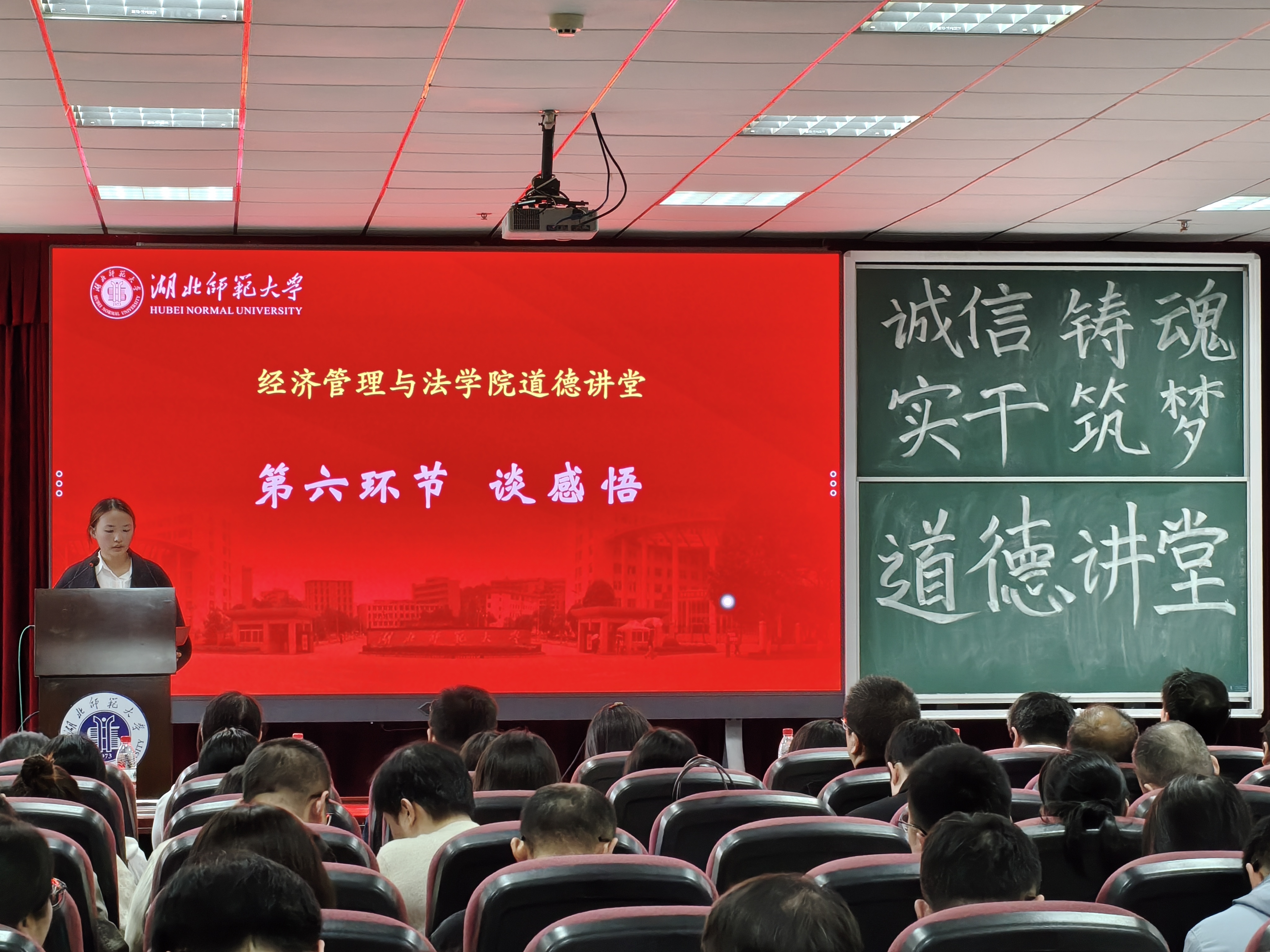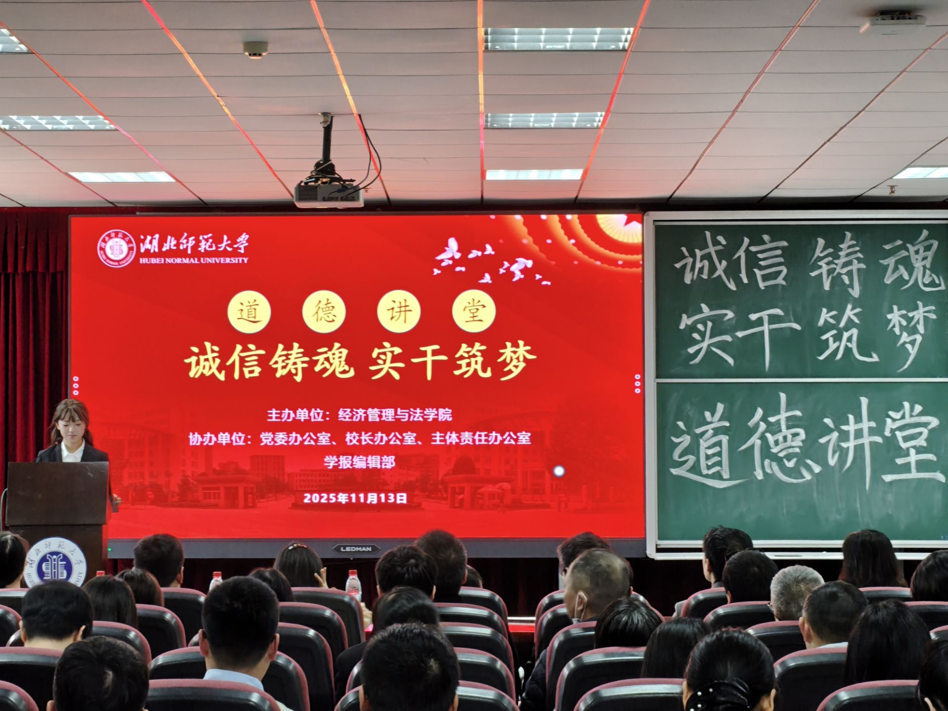 为深入贯彻落实习近平总书记关于加强诚信建设的重要指示精神,大力弘扬社会主义核心价值观,经济管理与法学院联合党委办公室、校长办公室、主体责任办公室以及学报编辑部,在信息大楼报告厅共同组织开展了以“诚信铸魂,实干筑梦”为主题的2025年道德讲堂活动。相关举办单位领导、教师、经管法学院第71期入党积极分子以及2025级学生代表共同参与。