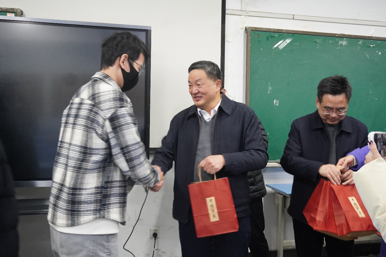 首先,雷儒金一行在若水轩学生社区驿站总站,看望慰问考研备考学生。雷校长关心同学们的备考情况,向同学们分享自己的备考经验,鼓励同学们要坚信持续的努力终将会有收获,并为学生们送上考研大礼包,祝愿同学们不负韶华,梦想成真。