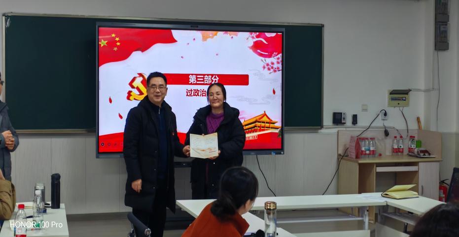 会上,在完成交纳党费、重温入党誓词和集体诵读党章等规定动作后,支部为一月份入党的高乐同志过政治生日。在集中学习环节邓光君、沈燕、侯彩云、王小丹、赵贤利等同志分别领学了《学习好贯彻好党的二十届四中全会精神》的说明、《中共中央关于制定国民经济和社会发展第十五个五年规划的建议》诞生记、中共黄石市委十四届九次全体会议、黄石市纪委监委通报6起违反中央八项规定精神问题典型案例、省纪委监委通报5起党员干部醉驾典型问题等重要文献及党纪学习教育材料。随后,杨冰楠、田卓亚同志结合教师党员身份,围绕如何主动作为,提升政治站位,将学习成果转化作为推动工作的基本思路和务实举措,为“十五五”良好开局贡献应有力量进行了交流。