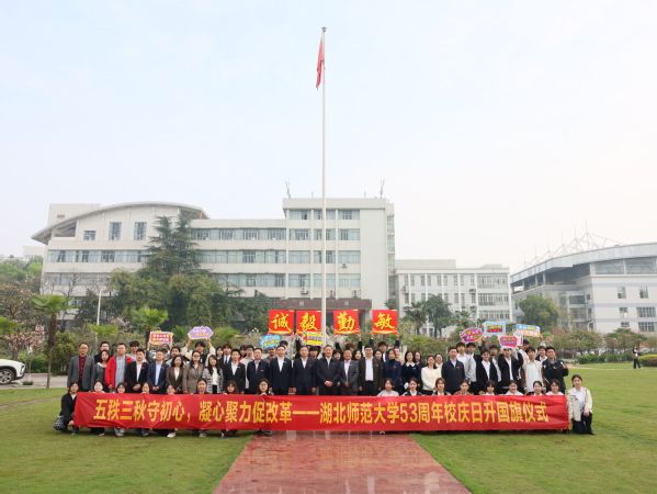 本网讯 4月7日上午,学校在中心篮球场举行建校53周年校庆日升国旗仪式。校党委副书记、校长雷儒金出席仪式并讲话。校友代表、武汉艾千家生物科技有限公司董事长吴险峰,党政办公室、学生工作部(处)、校友工作处相关负责人,yl23455永利官网、生命科学学院全体领导班子成员和师生代表参加仪式。校党委常委、统战部部长肖六亿主持仪式。