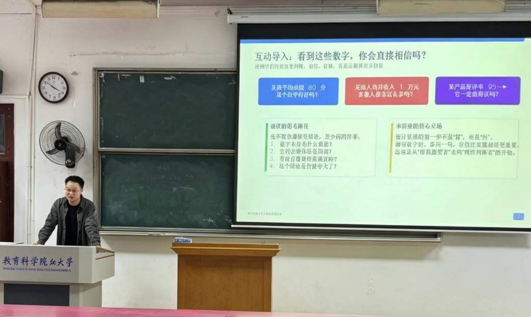 讲座伊始,肖老师以贴近生活的鲜活案例切入,围绕数字与真相的辩证关系展开分享。从班级平均分到商品好评率,这些看似客观严谨、精准直观、随处可见的统计数据,往往可能掩盖个体差异,造成认知偏差。他指出,唯有以批判性思维拆解辨析、科学验证,才能透过数据看清本质。讲授过程中,肖权老师将经典统计学理论与数字时代新特征有机融合,由浅入深、层层递进地解析了均值、数据分布、相关性与因果性等核心概念,系统梳理了统计学发展脉络与多元应用场景。现场同学专注聆听、积极思考,全程沉浸在浓厚的学术氛围中。